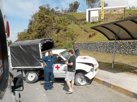 Por esquivar a un motociclista que, al parecer, invadió el carril, el conductor de un vehículo de la Cruz Roja Caldas se accidentó cerca a Expoferias. Juan Camilo Patiño, director de Socorro de la entidad, indicó ayer que, a las 8:00 a.m., el personal que iba en la camioneta se desplazaba a la sede, después de dejar un material en el Bosque Popular, cuando ocurrió el incidente. Agregó que el motociclista no se detuvo y el conductor de la Cruz Roja sufrió raspones.