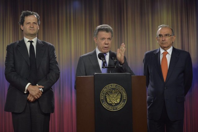 El presidente Juan Manuel Santos, en compañía del jefe negociador del gobierno en La Habana, Humberto de la Calle y del alto comisionado para la paz, Sergio Jaramillo, dio tres razones por las cuales no se firmó la paz el pasado 23 de marzo como se había establecido.