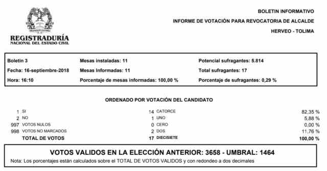 La Registraduría Nacional del Estado Civil informó que el proceso de revocatoria de mandato del alcalde del municipio de Herbeo (Tolima), no alcanzó la votación necesaria para prosperar ya que solo 17 personas acudieron a las urnas.