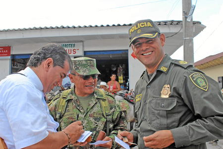 Pensilvania. El párroco de Arboleda, Jairo de Jesús Cardona, aprovechó la visita de muchas personas a su comunidad para asistir a un foro sobre víctimas y posconflicto el pasado fin de semana para ofrecer una rifa con bono de apoyo. Ni los coroneles Juan Carlos Chaparro, comandante del Batallón Ayacucho, y Necton Lincoln Borja, comandante de la Policía Caldas, se escaparon de comprar la boleta. Lo tomaron con muy buen humor cuando Borja comentó: “Aquí colaborando también con la iglesia”