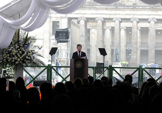 Allí, frente a un público que no tuvo Fuerza Pública entre sus asistentes, el presidente Santos hizo un llamado a encontrar a los desaparecidos y dedicó minutos a la necesidad de cesar el fuego en Colombia para siempre, en alusión al anhelo de la Paz, así como a su deseo a que la justicia y la verdad brillen de nuevo, luego de arder hace 30 años.
