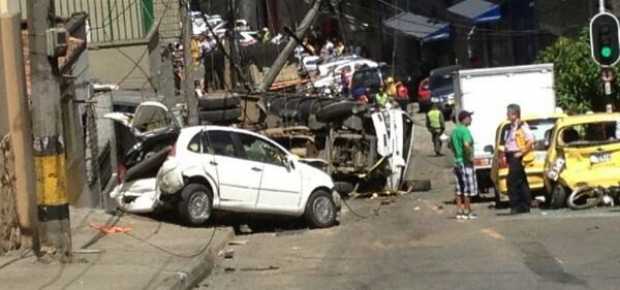 El conductor de una volqueta perdió el control del vehículo que se quedó sin frenos y se fue contra dos postes de luz. A su paso arrastró 21 vehículos y 15 motos.