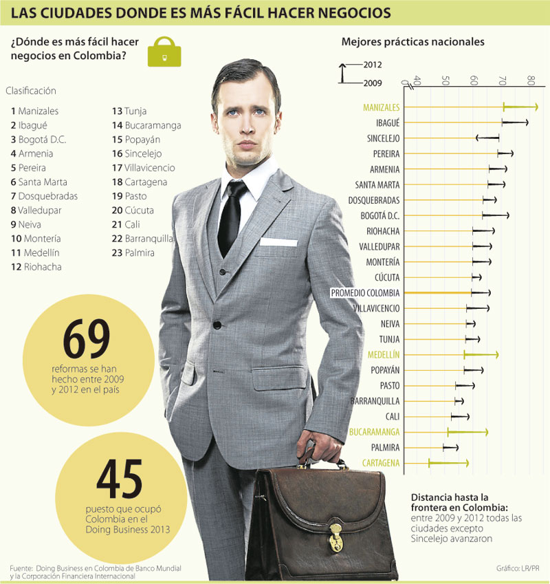 Las ciudades colombianas siguen mejorando su clima de negocios con reformas a las regulaciones que muchas veces les complican la vida a los empresarios. Manizales es la primera en ese proceso, que se mide en el Doing Business Colombia, un estudio que compara las regulaciones comerciales en 23 ciudades colombianas enfocándose en los controles nacionales y locales que afectan cinco etapas del ciclo de vida de las pequeñas y medianas empresas nacionales: apertura de empresas, obtención de permisos de construcción, registro de la propiedad, pago de impuestos y comercio transfronterizo. Gracias a los cambios, la capital de Caldas se pone a la altura de países como Corea del Sur y Dinamarca.