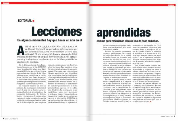 [No fue fue por la columna ni por poner en duda las explicaciones de su director], hubo otra cosa. Cuando hablé con él, me dijo algo que me desconcertó: Que mientras ‘Semana’ no diera una explicación satisfactoria, él iba a insistir en el tema en las próximas columnas, pues tenía mucha información que no había publicado en la primera. Eso me pareció inaceptable. Si su decisión era seguir poniendo en tela de juicio la credibilidad de la revista, lo lógico es que lo hiciera desde afuera.