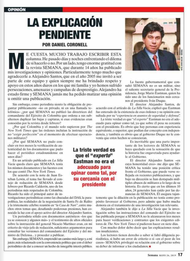 46. En la edición 1.934 de Semana, donde aparece la última columna de Coronell, la de Maria Jimena Duzán llevaba este título: “Donde manda capitán…”, refiriéndose a las amenazas recibidas por parte de los oficiales que denunciaron el posible regreso de los mal llamados “falsos positivos”.