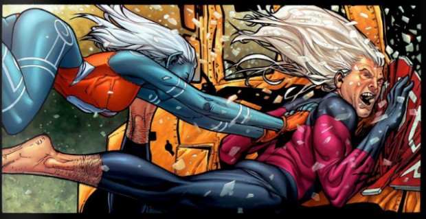 Namorita, de los New Warriors, estampilla a Nitro contra un bus escolar. El hecho será el detonante de la guerra.