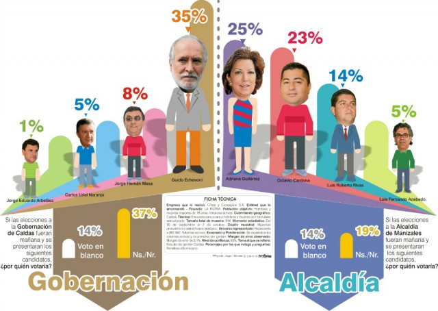 1. Me parece muy curioso el resultado, por varias razones. La primera porque tenemosla encuesta de CM& en la que nos coloca a todos en empate técnico. También porquehay una encuesta que mi campaña publicó en un aviso publicitario el pasado domingo enLA PATRIA que también nos coloca en el mismo empate y me parece muy curioso el resultado que se evidencia ahora. Por mucha publicidad negativa que me hayan hecho es muy difícil que en dos días se cambie del 24% al 14% la tendencia, sería un imposible. Lo único cierto es que estamos trabajando muy duro con unas estructuras y grupos políticos muy fuertes.