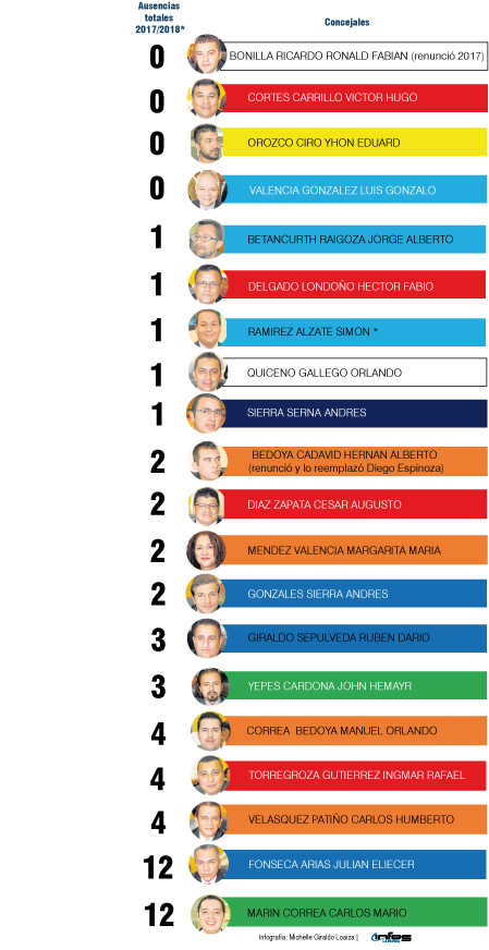 Los números recogidos mostraron que entre los más ausentes se encuentran los concejales Julián Eliécer Fonseca, del Partido Conservador y Carlos Mario Marín, del Partido Verde, quienes faltaron 12 veces cada uno.