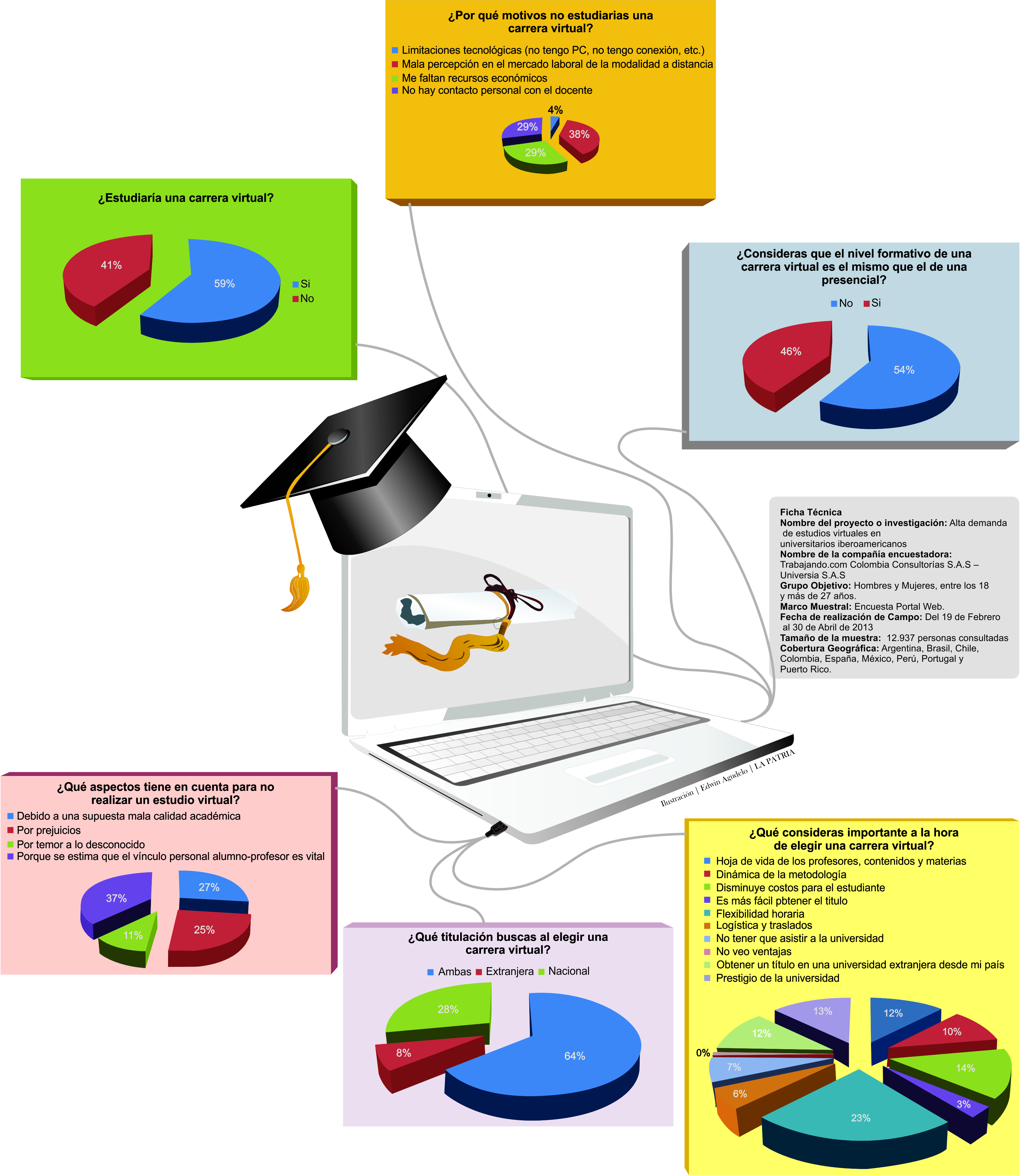 Trabajando.com y Universia realizaron una encuesta para indagar sobre los estudios virtuales. Participaron cerca de 13 mil universitarios de nueve países de Iberoamérica: Argentina, Brasil, Chile, Colombia, España, México, Perú, Portugal y Puerto Rico.