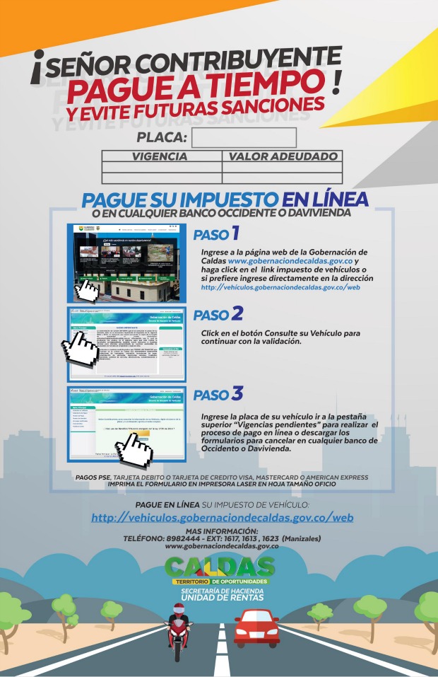 Para aprovechar este beneficio los contribuyentes podrán acercarse a la unidad de rentas, a los puntos de los centros comerciales Fundadores y Cable Plaza o descargar el formulario en la página web vehiculos.gobernaciondecaldas.gov.co/web/ y pagar en los bancos Davivienda y Occidente.