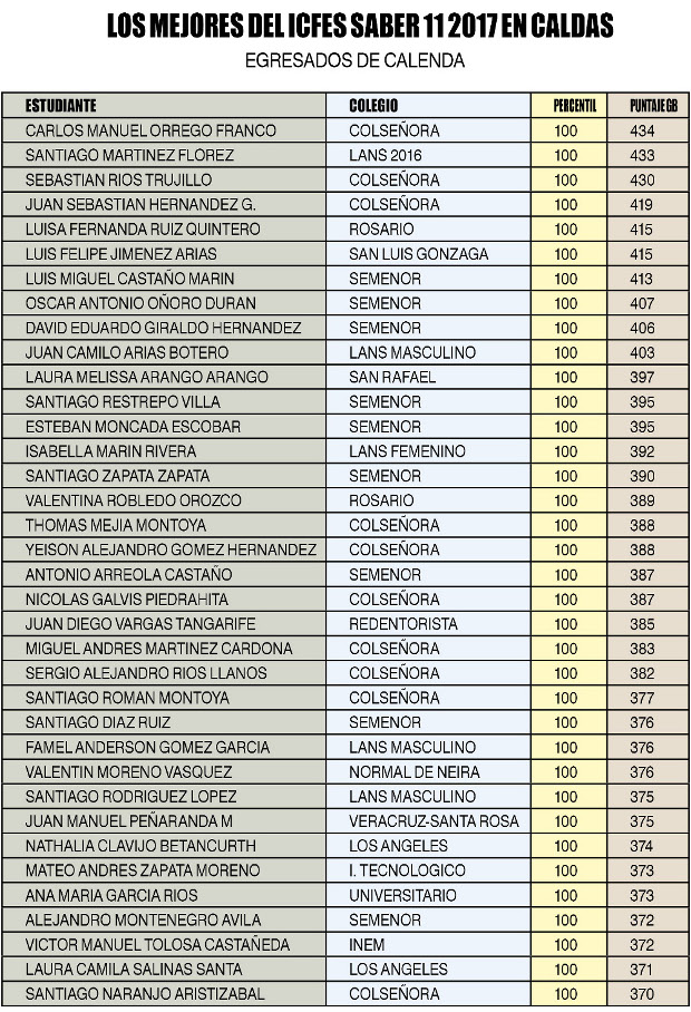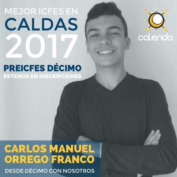 El mejor resultado en el examen ICFES SABER 11º 2017 de Caldas fue Carlos Manuel Orrego Franco, con un puntaje de 434 puntos, promoción 2017 del colegio COLSEÑORA. Adicionalmente obtuvo el 1er puesto en Caldas en el examen de admisión de la Universidad Nacional 2018-01, con 922 puntos fue admitido al programa de Ingeniería Civil (pto1) sede Manizales, por lo cual ingresa becado en primer semestre. Carlos Manuel se inscribió en el Preicfes Calenda desde el 2016, cuando cursaba 10º, por esta razón y por su perseverancia se convirtió en uno de los mejores puntajes del país en la prueba SABER 11.
