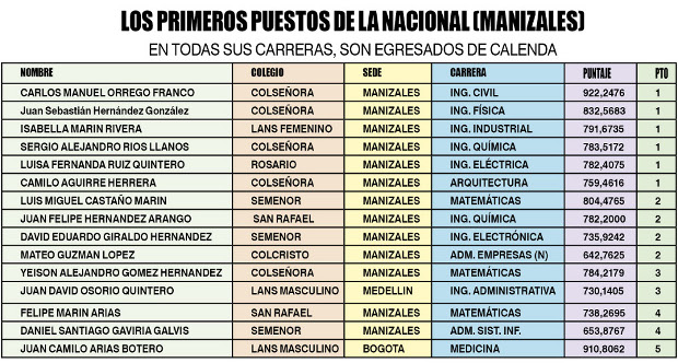 Solo en 2017 350 jóvenes egresados de Calenda fueron admitidos a los diferentes programas de la U. Nacional de Colombia y 280 a la U. de Caldas. En los dos programas de mayor demanda en la ciudad, Medicina (U. Caldas) e Ingeniería (Civil U. Nal). El 50% de sus admitidos pasaron por este Preuniversitario. Además, los primeros puestos de cada carrera en la Nacional que ingresan becados, cursaron los diferentes programas de Calenda.