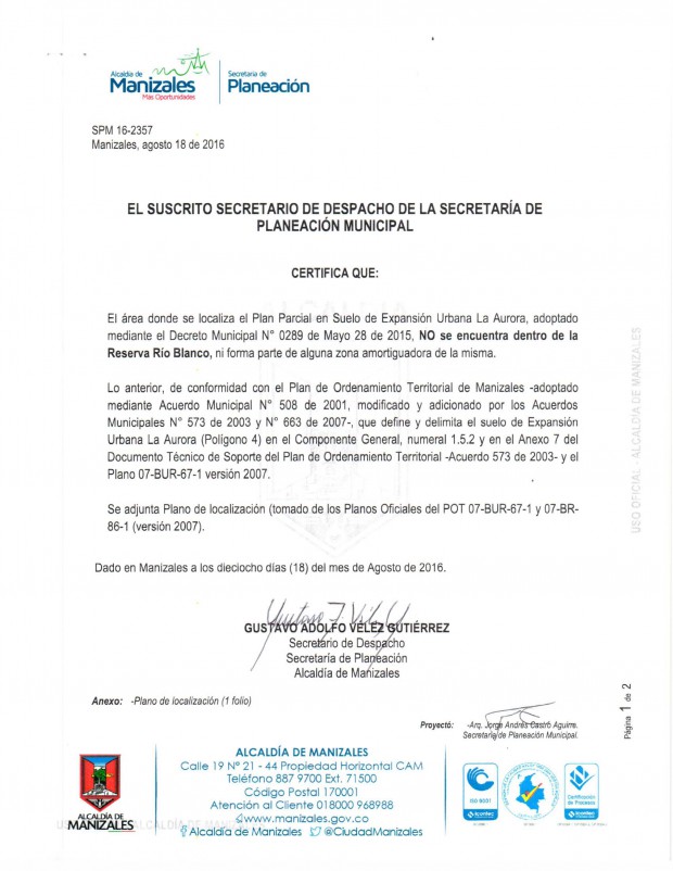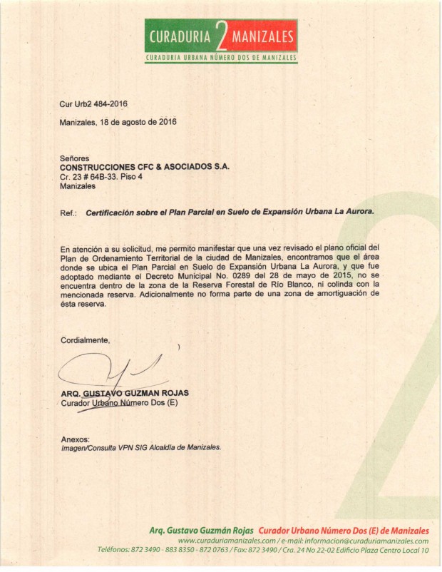 -Finalmente, el Alcalde de turno expidió el decreto 0289 de Mayo 28 de 2015, que adopta el Plan Parcial en Suelo de Expansión Urbana Sector La Aurora.