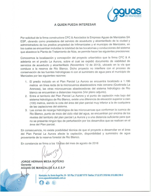 Aguas de Manizales, como entidad prestadora del servicio de acueducto y alcantarillado de la ciudad, certificó que no existe posibilidad técnica de que el proyecto a desarrollar en el área del Plan Parcial La Aurora afecte la captación, disponibilidad y suministro de agua proveniente de la reserva forestal de Río Blanco, ya que, en efecto, la bocatoma más cercana se encuentra a más de un kilómetro de distancia y a 95 metros por encima de la cota en la que se desarrollará la biociudadela TierraViva.