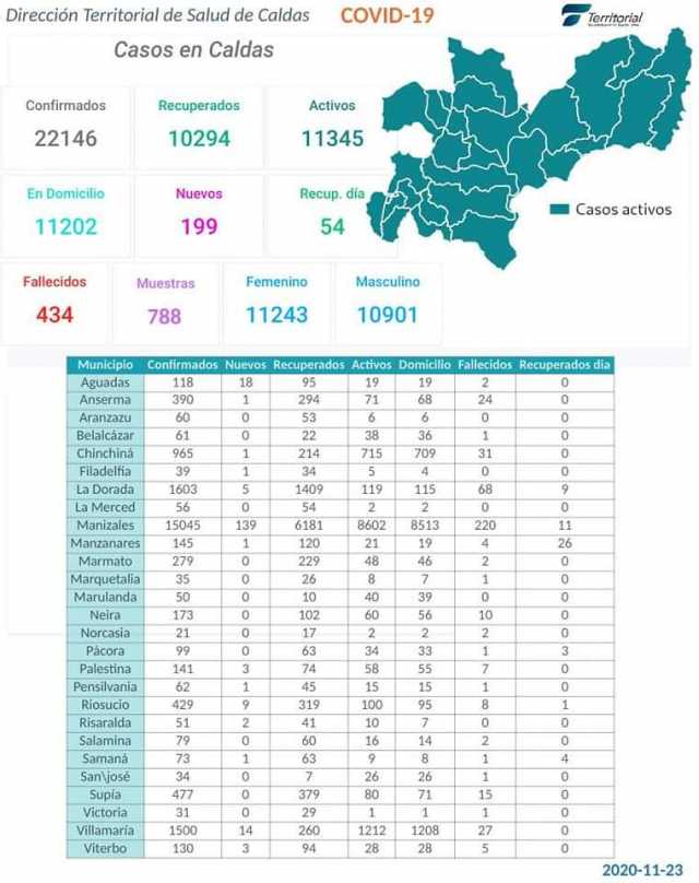 11.345 casos activos de covid-19 hay en Caldas: este lunes se reportaron 199 nuevos contagios