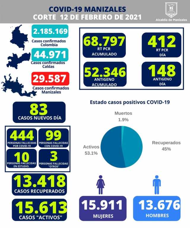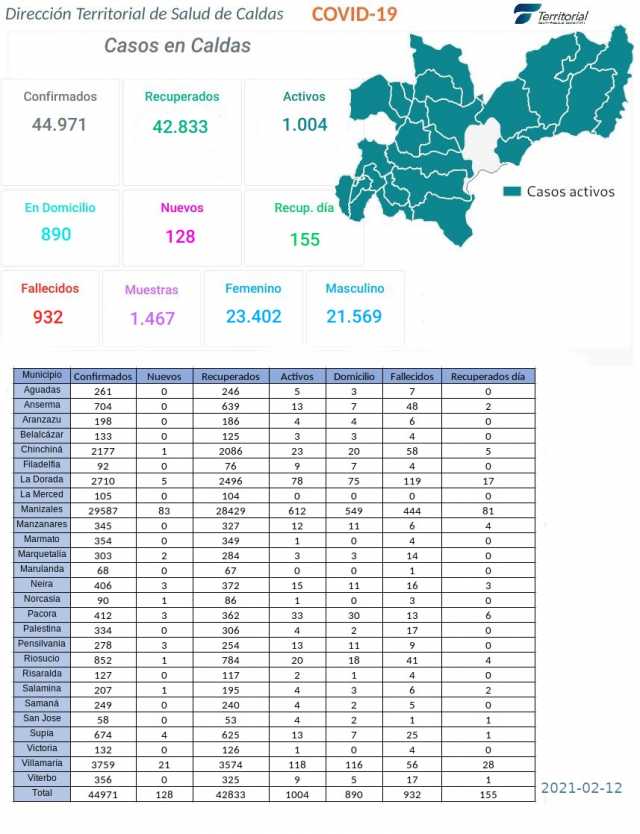 Con los datos de la jornada, Caldas asciende a 44 mil 971 contagiados y a 932 fallecidos.
