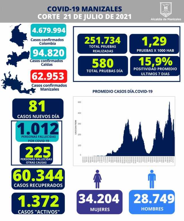 152 nuevos contagios y 7 fallecidos de covid-19 en Caldas