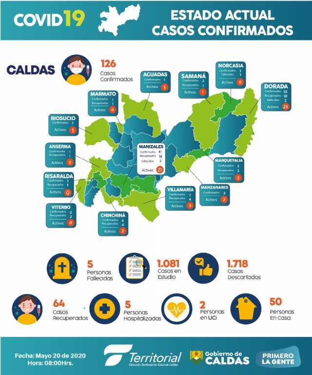 Caldas reporta 126 casos, 64 recuperados y 5 fallecidos.