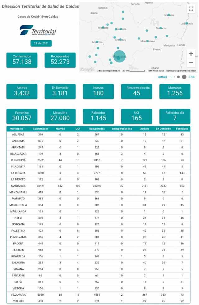 La Dirección Territorial de Salud de Caldas reportó este sábado 180 nuevos casos de covid-19, con esta cifra asciende a 57.138 confirmados.