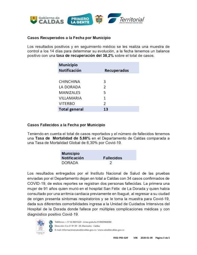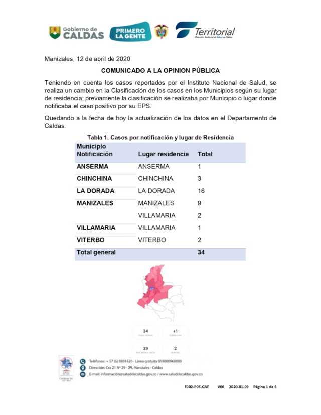 Caldas se mantiene con 34 casos, según lo reportó ayer la Dirección Territorial de Salud del departamento en su reporte. De elos 13 recuperados y dos fallecidos de La Dorada. El caso que reporta el Ministerio de Salud de nuevo para Caldas, el caso 34 es de Manizales. Un hombre, de 34 años, que viajó de brasil. Está en casa.