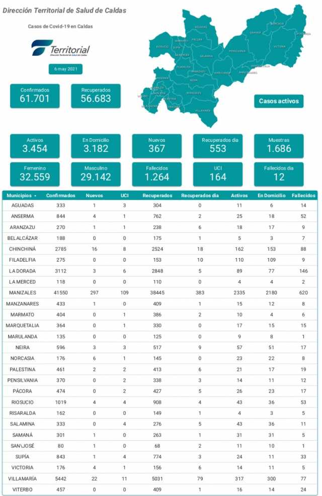 La Dirección Territorial de Salud de Caldas reportó este jueves 367 nuevos casos, con esta cifra asciende a 61.701 confirmados.