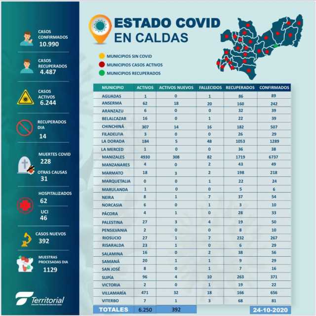 Los nuevos casos se reportaron en Anserma (18), Chinchiná (14), La Dorada (5), Manizales (308), Marmato (3), Neira (1), Pácora (1), Palestina (3), Riosucio (1), Risaralda (1), Samaná (1), Supía (4), Villamaría (32) y Viterbo (1).