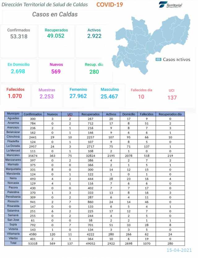 De los 569 casos del día, Manizales tiene 363, Villamaría 120, Chinchiná 29 y La Dorada 24, como los municipios con más infectados de la jornada.