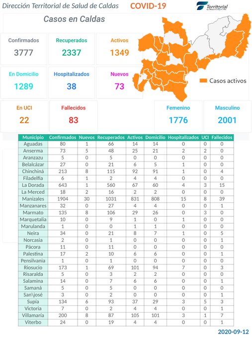 Los nuevos casos se presentaron en Aguadas (1), Anserma (5), Chinchiná (8), Filadelfia (1), La Dorada (1), La Merced (2), Manizales (30), Marmato (8), Palestina (2), Riosucio (1), Supía (6) y Villamaría (8).