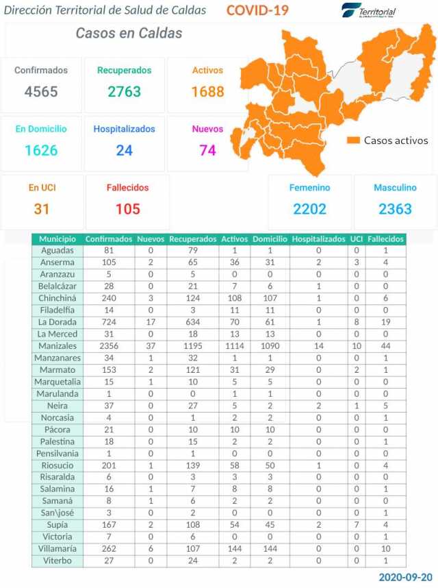 Los nuevos casos son en Anserma (2), Chinchiná (3), La Dorada (17), Manizales (37), Manzanares (1), Marmato (2), Marquetalia (1), Riosucio (1), Salamina (1), Samaná (1), Supía (2) y Villamaría (6).