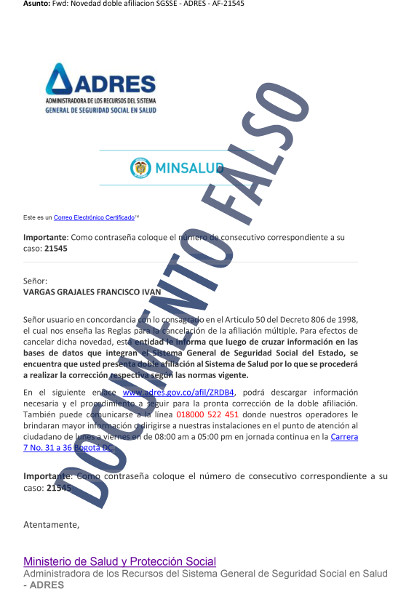 En los mails señalados, presuntos delincuentes contactan a los afiliados al sistema con una comunicación falsa sobre una doble afiliación a una EPS. En la misiva les sugieren ingresar a un portal web para consultar sobre el problema, lo que descarga un software malicioso que le permite a estos desconocidos acceder a la información de los computadores (claves, fotos, documentos personales, etc).