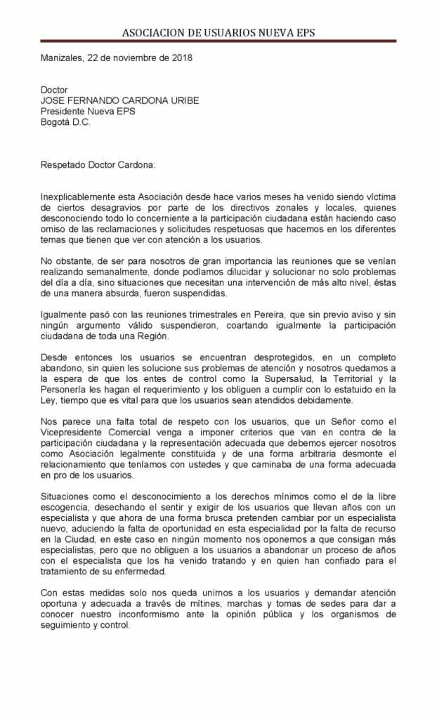 A este caso se suma el descontento que manifestó Gabriel Palacio, director de la Asociación de Usuarios de la Nueva EPS. Él direccionó una carta a José Fernando Cardona Uribe, presidente nacional de la EPS, de la que dice aún no hay respuesta.
