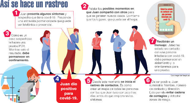 El cerco epidemiológico comienza con una entrevista pormenorizada (ver infografía), que se puede dar por diversas situaciones, como sucedió hace poco con una persona que estuvo en una fecha específica haciendo fila en un banco de la ciudad.