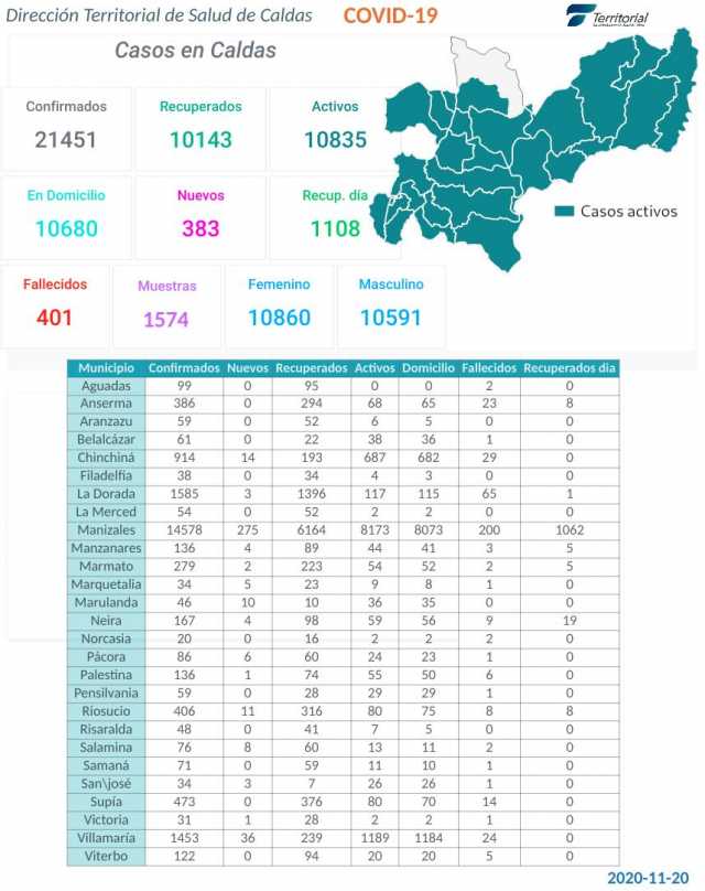 Caldas tiene 10 mil 143 recuperados, 10 mil 835 casos activos y 401 fallecidos.