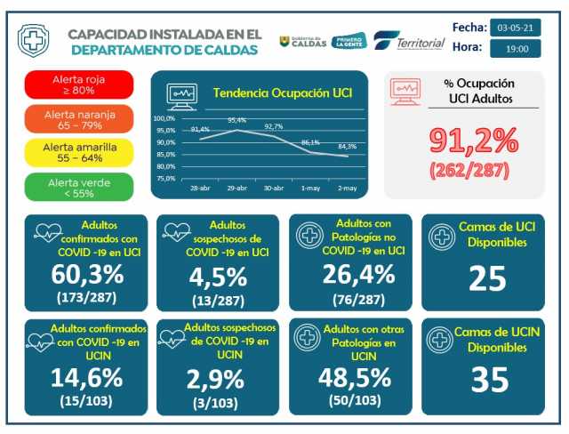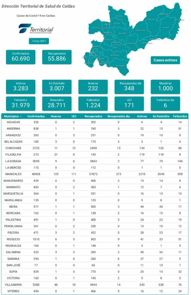 La Dirección Territorial de Salud de Caldas reportó este lunes 232 casos nuevos de covid-19 y 6 personas fallecidas.