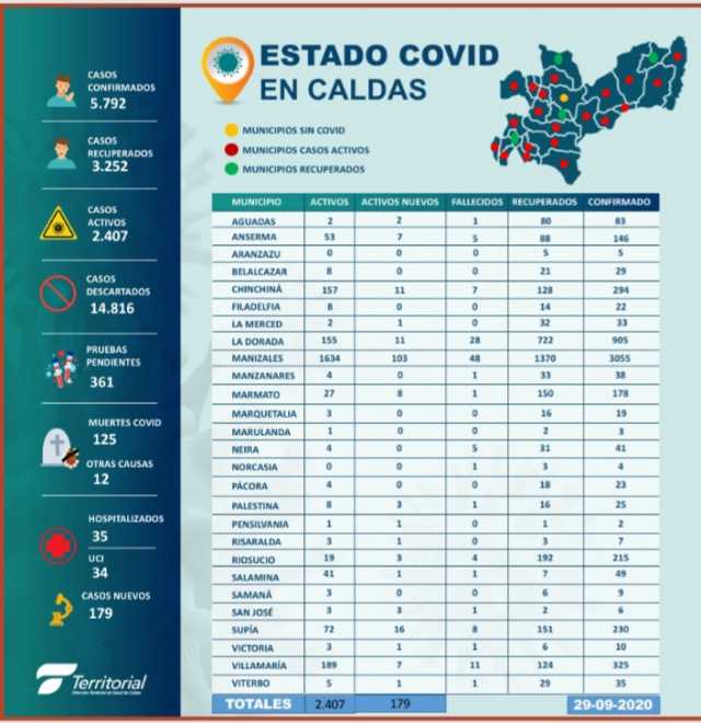 El departamento suma 5.792 casos confirmados, de los cuales 3.252 se han recuperado, 2.407 siguen activos (35 hospitalizados y 34 en UCI). 125 personas han fallecida en Caldas por el virus.