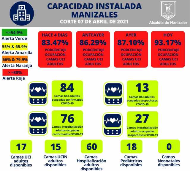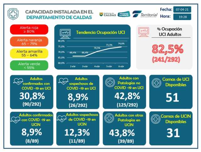 Además notificó que el departamento está en alerta roja por la ocupación de camas UCI que ascendió al 82,5%: de las 292 camas solo hay 51 disponibles. 241 están ocupadas: 90 con pacientes covid-19, 26 con personas sospechosas de tener el virus y 125 con pacientes con patologías no covid-19.