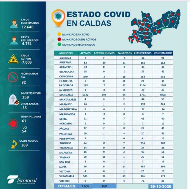 Con los datos de hoy, Caldas asciende a 12 mil 646 positivos y a 258 muertes.