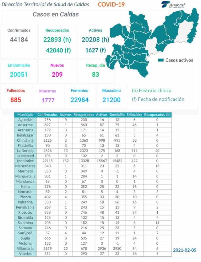 La Dirección Territorial de Salud de Caldas reportó este viernes 209 nuevos casos, con esta cifra asciende a 44.184 los confirmados.