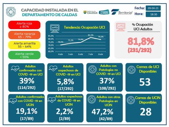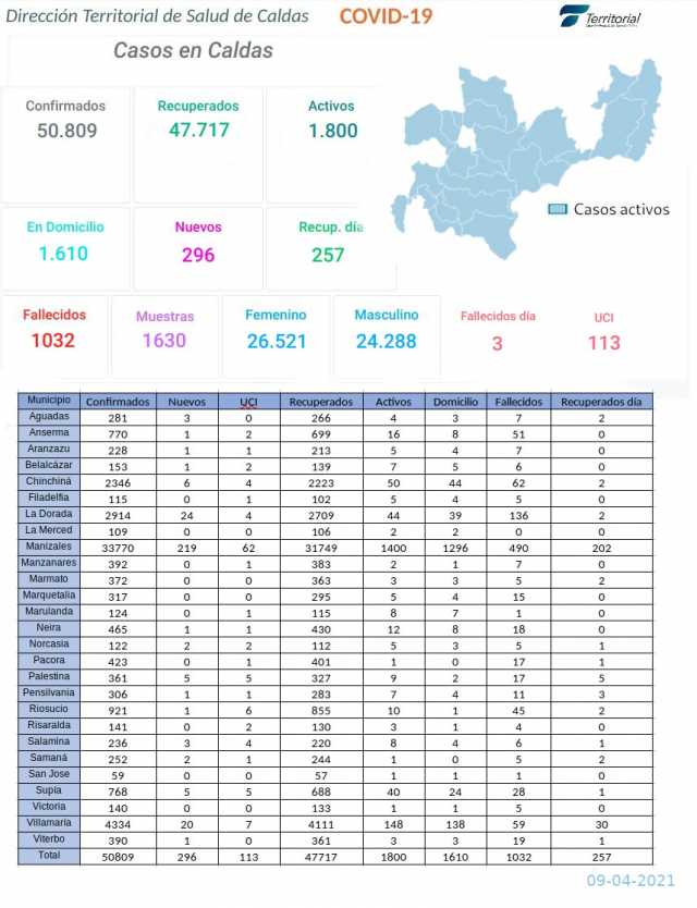 Los nuevos casos se presentaron en Aguadas (3), Anserma (1), Aranzazu (1), Belalcázar (1), Chinchiná (6), La Dorada (24), Manizales (216), Neira (1), Norcasia (2), Palestina (5), Pensilvania (1), Riosucio (1), Salamina (3), Samaná (2), Supía (5), Villamaría (20) y Viterbo (1).