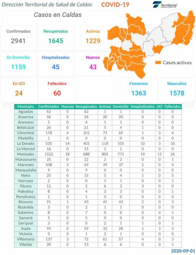 En Caldas se han confirmado 2.941 casos, de los cuales 1.645 se han recuperado, 1.229 están activos y 60 murieron. En este momento hay 45 personas hospitalizadas y 24 en Unidades de Cuidados Intensivos, 1.159 se recuperan en su domicilio.