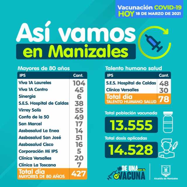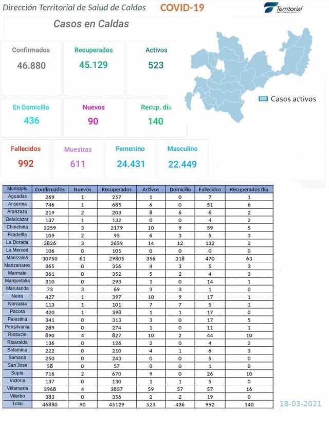 La Dirección Territorial de Salud de Caldas informó este jueves 90 nuevos casos de covid-19, con esta cifra asciende a 46.880 confirmados.