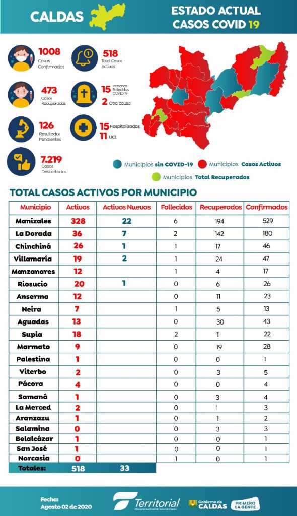 La Dirección Territorial de Salud de Caldas reportó este domingo 33 nuevos casos de covid-19. El departamento llega a los 1.008 contagios. "Los 1023 que notificó el INS se encuentran sujetos a verificaciones y ajustes, ya que se hace el respectivo seguimiento caso por caso", indicó la entidad.