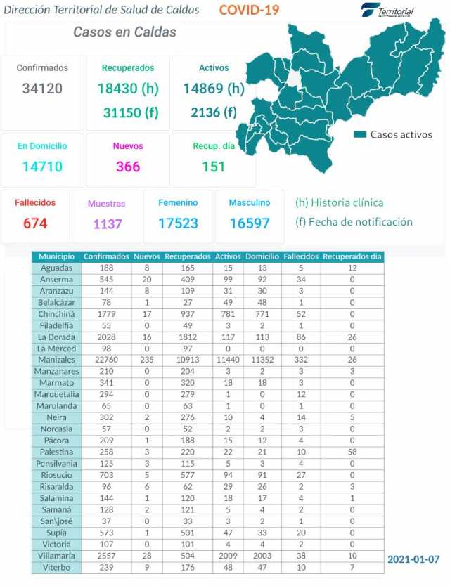 La Dirección Territorial de Salud de Caldas reportó este jueves 366 nuevos casos de covid-19. Con esta cifra asciende a 34.120 los confirmados.