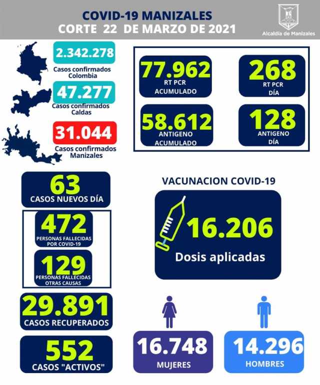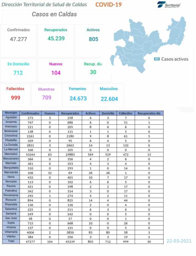 Con las cifras del día, Caldas asciende a 47 mil 277 confirmados. Tiene 45 mil 239 recuperados y 805 casos activos.
