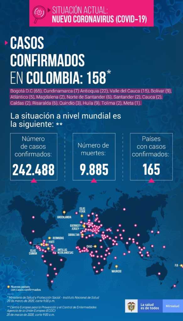 El último reporte del Instituto Nacional de Salud, con corte a las 8:00 de la noche de este viernes, confirmó 13 nuevos casos de coronavirus en Colombia, con lo que la cifra total de personas con la enfermedad subió a 158 en todo el país.