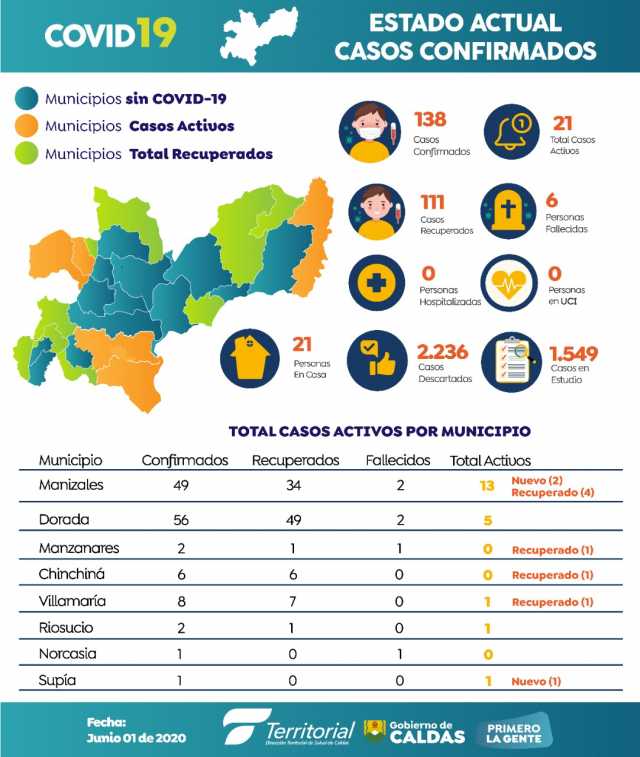 El departamento, según el reporte de ayer de la Dirección Territorial de Salud de Caldas, tiene 138 contagios, 111 recuperados y 6 fallecidos.