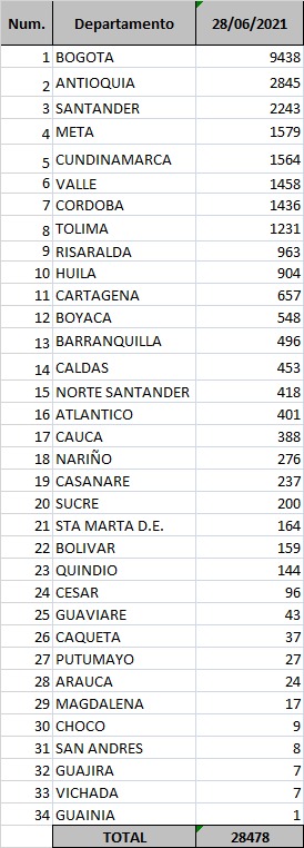 Las 648 muertes, de las cuales 572 ocurrieron en días anteriores, estuvieron principalmente en Bogotá (154), Santander (53), Antioquia (49), Cundinamarca (47), Valle del Cauca (45), Córdoba (33), Bolívar (27), Nariño (24), Tolima (23), Atlántico (21) y Risaralda (20).