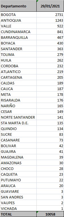 La región que más casos tuvo hoy fue, una vez más, Bogotá, con 2.731, seguida de los departamentos de Antioquia (1.243), Valle del Cauca (922), Cundinamarca (841), Atlántico (686), Boyacá (430), Santander (363), Tolima (279) y Huila (262).