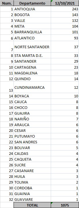 El boletín diario de la autoridad sanitaria detalló que la mayor cantidad de las infecciones reportadas en esta jornada ocurrió en Antioquia, que tuvo 243 casos, seguido Atlántico (194), Bogotá (143), Valle del Cauca (132) y Meta (104).