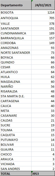 La mayor cantidad de casos los acumulan las regiones de Bogotá (654.204), Antioquia (342.789), Valle del Cauca (194.047), Atlántico (122.497), Cundinamarca (104.850), Santander (90.280), Bolívar (66.507), Tolima (64.990) y Norte de Santander (50.595).